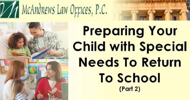 August 2018 In this two-part series, Alex Corbin, Esq. of McAndrews Law Offices, P.C. reviews the first five tips for Preparing Your Child with Special Needs To Return To School …
