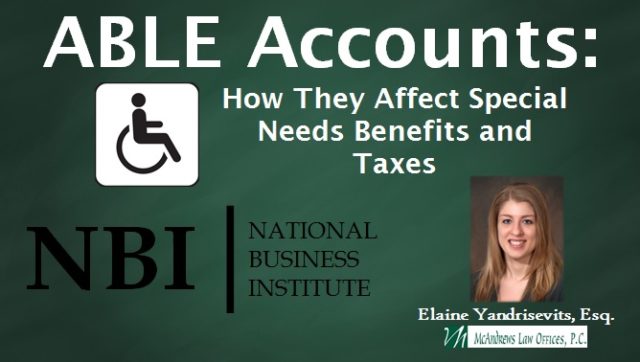 Live Teleconference with Elaine Yandrisevits of McAndrews Law Offices! Hosted by NBI: NATIONAL BUSINESS INSTITUTE Continuing Legal Education for Professionals Tuesday, January 31, 2017 ABLE accounts are rapidly becoming an…