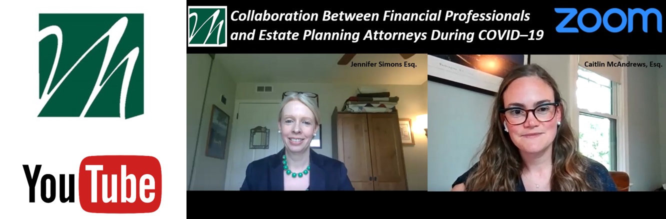 This third presentation entitled “Collaboration Between Financial Professionals and Estate Planning Attorneys During COVID–19” is provided by Caitlin McAndrews, Esq. and Jennifer Simons, Esq. Collaboration between financial planners and estate planning attorneys is especially important in times of significant economic and life change like that which we are facing right now. This webinar discusses the intersection between these two fields and how they can work more effectively together.