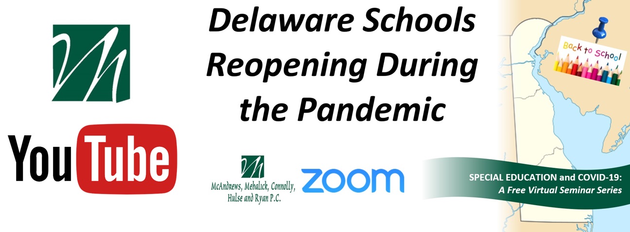 The third presentation of the series entitled “Delaware Schools Reopening During the Pandemic” is presented by Caitlin McAndrews, Esq. and Alexander Corbin, Esq. They offer an overview of the Delaware Department of Education’s plan (DDOE), what parents can expect from School Districts and Charter Schools, strategies for the different learning options, IDEA obligations, and advocacy for student’s with IEPs. Click the link below to watch the full seminar!