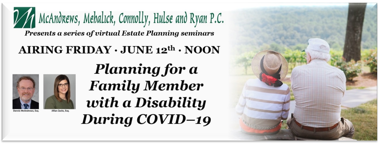 Our Estate Planning Department continues to present a series of free virtual seminars in the upcoming weeks to assist families and professionals in coping with issues related to the current health crisis, while planning for next steps in the weeks and months to follow. Our second presentation of the series entitled: “Planning for a Family Member with a Disability During COVID – 19” will be provided by Dennis McAndrews, Esq. and Jillian Zacks, Esq.