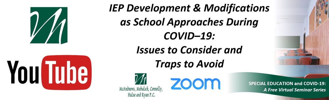 September 2020: The Special Education Department at McAndrews, Mehalick, Connolly, Hulse and Ryan P.C. continues to present “Special Education and COVID-19: A Virtual Seminar Series” in the upcoming weeks to assist families that are facing educational issues related to the current health crisis.