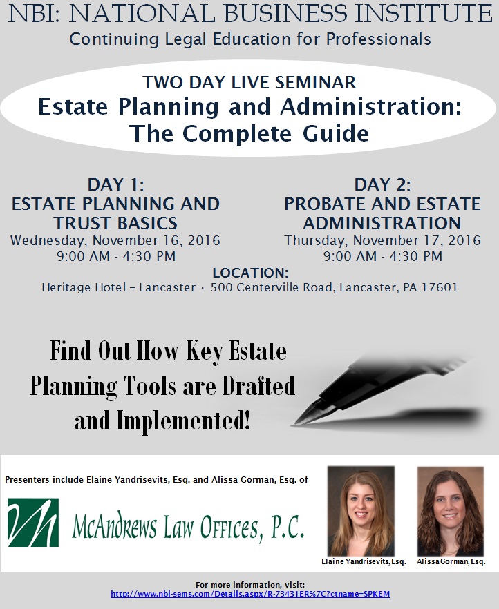 NBI: NATIONAL BUSINESS INSTITUTE – Continuing Legal Education for Professionals will host a two day live seminar titled “Estate Planning and Administration: The Complete Guide.” Elaine Yandrisevits, Esq. and Alissa Gorman, Esq. of McAndrews Law Offices will both be guest speakers at the event. For more information, click here.
