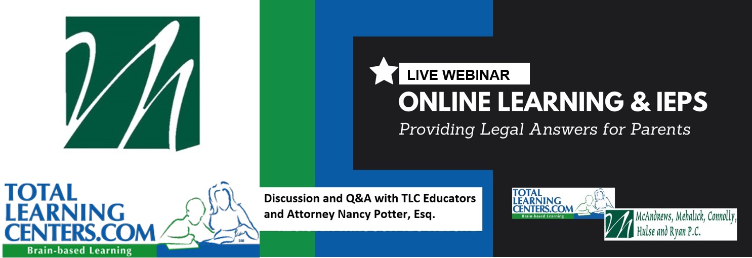 A virtual seminar featuring Nancy Potter, Esq. of McAndrews, Mehalick, Connolly, Hulse and Ryan P.C. and hosted by Total Learning Centers. Struggling with Online Learning? Find out what school resources you have a legal right to request. You have questions, Attorney Nancy Potter and Experts from Total Learning Centers have answers.